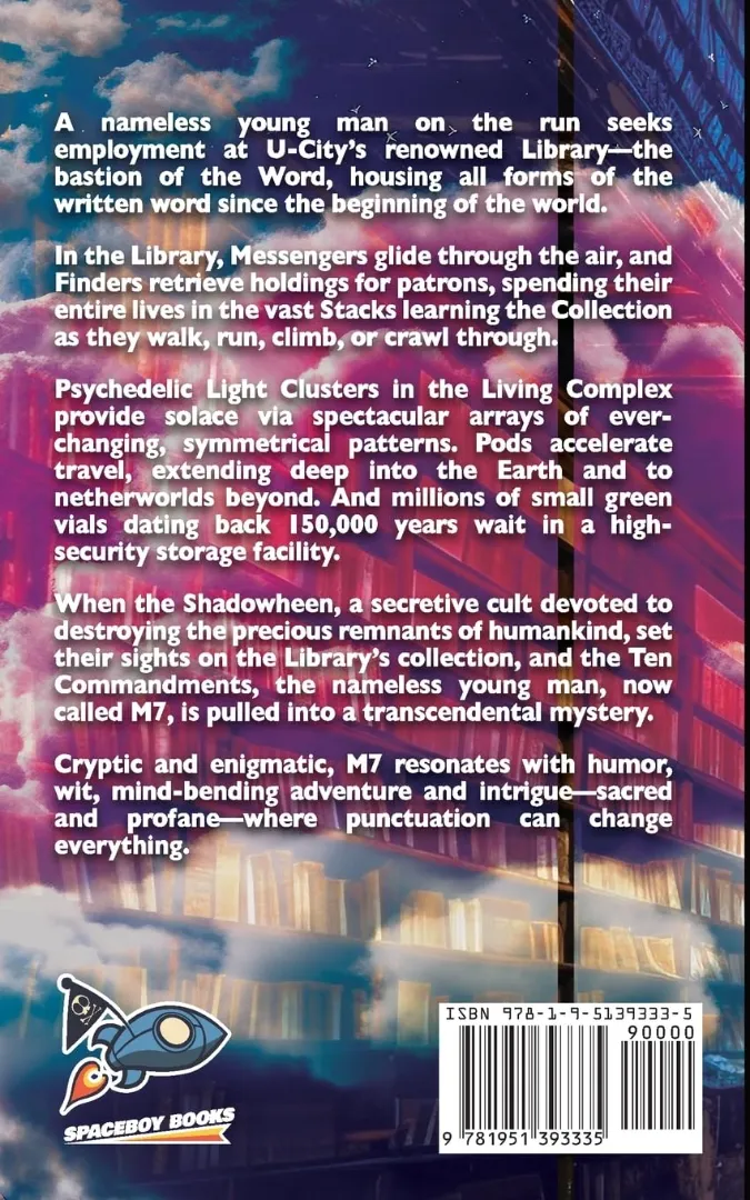 Mark Katzman’s M7 is a wildly imaginative, brain-bending adventure through the sacred halls of a psychedelic, futuristic archive where punctuation might just save the world. Or ruin it.